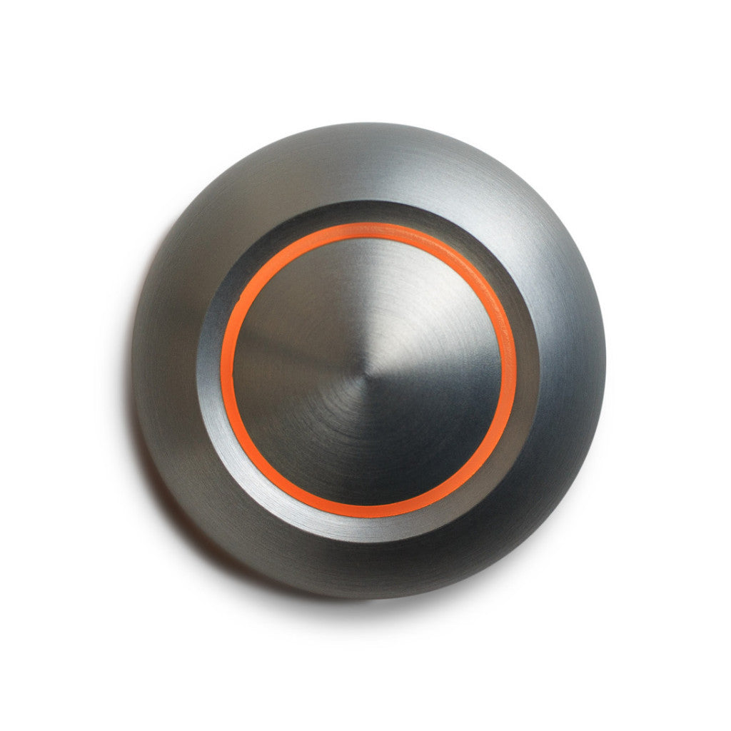 True is a silver-toned doorbell button that bridges the gap between modern and traditional design. An all-metal push button is surrounded by a thin halo of LED-illuminated color, which also reflects against the mounting surface.